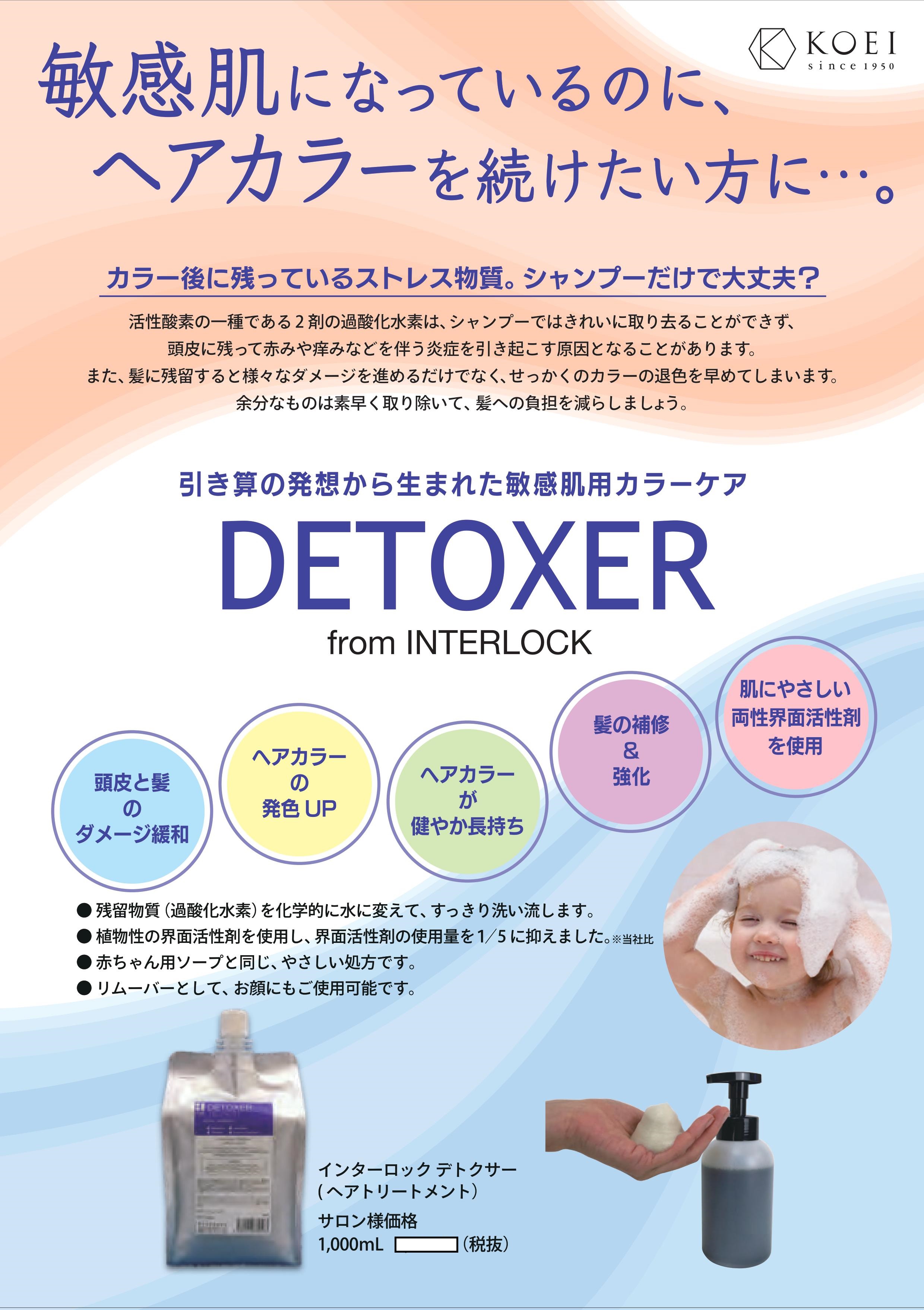 カラー後2日位は頭が痒いと言っていたお客様の為に色々つかってます。 シャバシャバの液体でフォーマーで使ってます。 乳化→すすぎ→デトクサー塗布してそのままシャンプーしてます。 オキシロンも併用しているのでこれだけでは無いかもしれませんが、 全く痒くなくなった!と言ってくれました。 カタラーゼ、ヘマチンが入ってるのが大事かなと思ってます。